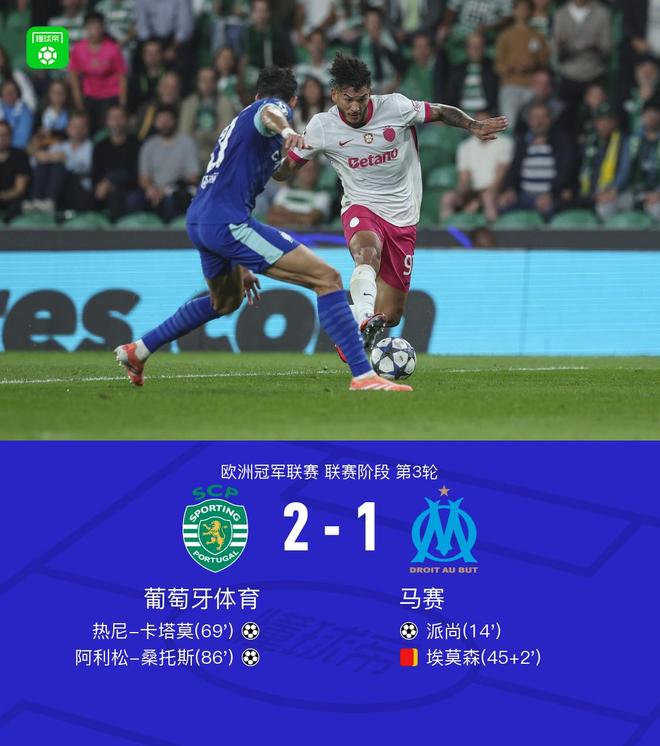 北京时间10月23日,欧冠联赛第三轮比赛中,里斯本竞技对阵马赛。葡萄牙体育队杰尼·卡塔莫进球,阿利森·桑托斯进球。马赛派桑进球。最终葡萄牙体育2-1马赛。主赛事第14分钟,奥巴梅扬长传,派桑内切破门。马赛1-0。第44分钟,点球被判无效,埃莫森被判假摔,吃到第二张黄牌。第69分钟,贡萨尔维斯助攻,卡塔莫破门扳平比分。葡萄牙竞技1-1,第86分钟,桑托斯内切击中防守球员折射入网。体育CP 2-1,双方球员进入激动人心的时刻。比赛即将开始。第14分钟,奥巴梅扬长传内切派桑萨破门。马赛1-0。第35分钟,特林康接到后场长传后,弧顶处射门。球由守门员持有河第44分钟,点球被取消。埃莫森因假摔被判犯规,并吃到第二张黄牌。第60分钟,路易斯·苏亚雷斯内切斜射攻门。球没有射中球门。第69分钟,冈扎尔。维斯助攻,卡塔莫主罚扳平比分,CP体育1-1。第86分钟,桑托斯的射门击中后卫折射入网。葡萄牙体育2-1,第90+2分钟,阿劳霍推倒纳迪尔,吃到红牌。经VAR审核后,决定改为黄牌。技术统计
