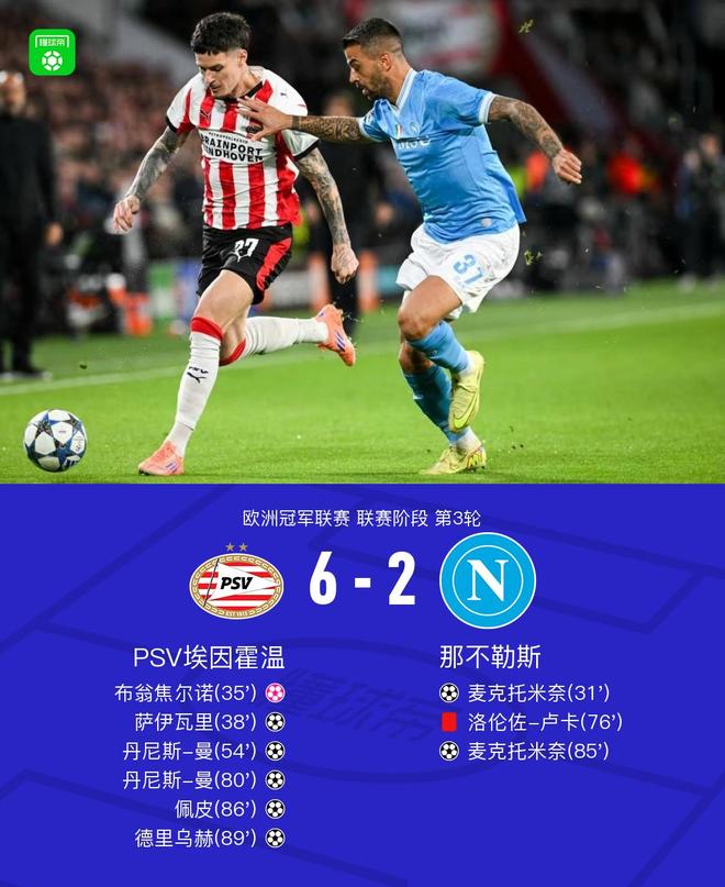 北京时间10月22日,欧冠联赛第三轮比赛开始,埃因霍温对阵那不勒斯。比赛一开始,那不勒斯就在斯皮纳佐拉的助攻下,由麦克托米奈的进球领衔。随后,布翁焦尔诺意外打入乌龙球,为埃因霍温队再下一城。紧接着,蒂尔助攻萨瓦里,帮助球队取得领先。上半场结束前,毛罗·儒尼奥尔送出精彩传球,丹尼斯·曼推射进一步扩大领先优势。下半场比赛易边再战,J-费尔曼精准传球帮助丹尼斯·曼再下一城,完成个人第二粒进球。此后,那不勒斯球员洛伦佐·卢卡被红牌罚下,球队陷入人数匮乏的境地。随后内雷斯为麦克托米奈创造了机会,麦克托米奈再次破门,梅开二度。比赛进入最后阶段,德里赫帮助佩皮破门,埃因霍温继续扩大比分。之前下半场,佩皮传球帮助德里赫射门入网,锁定比分。全场比赛结束,埃因霍温6-2战胜那不勒斯。主赛事第31分钟,斯皮纳佐拉传中,麦克托米奈头球破门。那不勒斯1-0埃因霍温。第35分钟,佩里西奇传球,不小心让布翁焦尔诺自摆乌龙。第38分钟,埃因霍温1-1那不勒斯。伊维里单刀破门,埃因霍温2-1那不勒斯。第54分钟,儒尼奥尔助攻,丹尼斯·曼再进一球。埃因霍温 2-1 那不勒斯。第76分钟,洛伦佐·卢卡不享受处罚并进行言语攻击。裁判向他出示了红牌并将他罚下场。第80分钟,丹尼斯·马内射门破门。埃因霍温 4-1 那不勒斯。第85分钟,角球被判。麦克托米奈头球破门。那不勒斯2-4。第86分钟,德里赫助攻。 ,佩皮推射破门,埃因霍温5-2。第89分钟,德里赫外线破门。双方选手进入比赛的瞬间 PSV 6-2。比赛第7分钟,斜传直塞。德布劳内越过了门将,越过了底线。不幸的是,没有队友能够包抄他。第18分钟,萨瓦里越位,进球被判无效。第27分钟,贡肖洛夫斯基犯规,裁判向其出示黄牌。第31分钟,斯皮纳佐拉传中,麦克托米奈头球破门。那不勒斯1-0埃因霍温。第35分钟,佩里西奇传球。布翁焦尔诺不慎自摆乌龙。埃因霍温1-1那不勒斯。第38分钟,萨瓦里单刀破门扳平比分。第54分钟,埃因霍温2-1那不勒斯。 ,儒尼奥尔助攻,丹尼斯·曼再下一城,埃因霍温2-1那不勒斯。第66分钟,舒滕禁区外射门,皮球击中立柱弹出。第76分钟,洛伦佐·卢卡对判罚不满意,辱骂裁判。他在出示红牌后被罚下场。第80分钟,丹尼斯马内内切破门。埃因霍温4-1那不勒斯。第85分钟,角球被判。麦克托米奈头球破门。那不勒斯2-4。第86分钟,德里赫助攻佩皮头球破门。进球,埃因霍温5-2。第89分钟,德里赫外围射门破门,埃因霍温6-2。球队阵容 技术统计